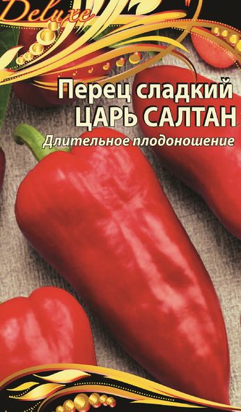ПЕРЕЦ ЦАРЬ САЛТАН Длительное плодоношение Среднеспелый (115–130 дней) сорт для выращивания в открытом грунте и под пленочными укрытиями. Растение полуштамбовое, полураскидистое, высотой 50–60 см. Плод конусовидной формы, длинный, глянцевый, массой 150–170 г. Толщина стенки 5,0–5,5мм. Окраска плода в технической спелости светло-зеленая, в биологической — красная. Мякоть сладкая, ароматная, сочная. Урожайность в пленочных теплицах 8,0–8,5 кг/кв.м. Используется в домашней кулинарии, для консервирования, маринования и приготовления «лечо». Ценность сорта: высокая урожайность, хорошая завязываемость и выравненность плодов, устойчивость к болезням.